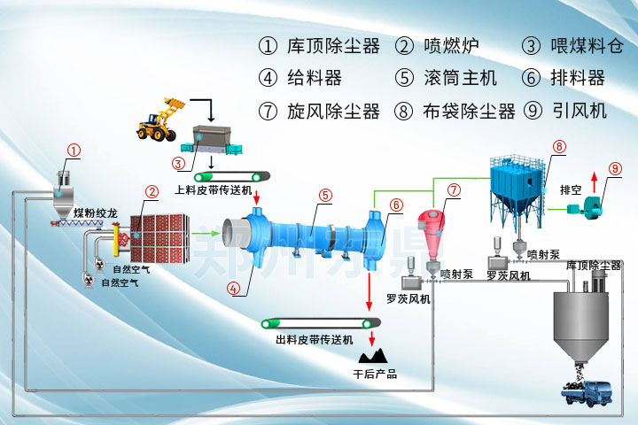 ⑵ 燃燒供熱系統(tǒng):選用煤粉噴燃爐、煤粉料倉、氣流輸送等設(shè)備,確保向干燥系統(tǒng)提供穩(wěn)定的高溫?zé)峤橘|(zhì);