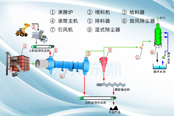 經(jīng)破碎后的矸石煤原料 先經(jīng)皮帶輸送機(jī)輸送至給料箱,然后推入滾筒干燥機(jī)后由大傾角導(dǎo)料板將其迅速導(dǎo)向傾斜揚(yáng)料板區(qū),并隨滾筒的轉(zhuǎn)動和筒體的傾斜度,被自筒底提至筒頂而落下,形成“料幕”,與同物料一起進(jìn)入到滾筒內(nèi)部由熱風(fēng)爐熱源產(chǎn)生的高溫?zé)煔饨粎R進(jìn)行質(zhì)熱交換,使?jié)裎锪项A(yù)熱并蒸發(fā)部分水分,當(dāng)物料又被提起、灑落重復(fù)幾次后,移動到活動蓖條式翼板段,預(yù)熱過的活動蓖條式翼板夾帶物料提起灑落重復(fù)多次,與物料形成傳導(dǎo)和對流質(zhì)熱交換,物料與煙氣基本完成質(zhì)熱交換,物料成為干后產(chǎn)品,煙氣成為廢氣,為減少揚(yáng)塵,烘干機(jī)尾部不設(shè)揚(yáng)料板,使物料滑落至排料箱,而經(jīng)過熱交換之后含有大量水蒸氣及粉塵的尾氣經(jīng)過旋風(fēng)除塵,被去除掉大部分粉塵后進(jìn)入布袋除塵器凈化,凈化后的尾氣直接排放,形成整個干燥過程。