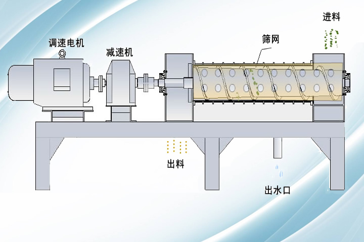 酒糟脫水機(jī)是通過(guò)機(jī)械外力擠壓及壓榨把酒糟中的液體分離出去,留下固體物質(zhì),原理如下需脫水的物料從進(jìn)料口進(jìn)入擠壓機(jī),物料被錐型螺旋擠壓脫水后,送至出料口,其大部分的水份從篩板濾出。從而達(dá)到脫水的目的。脫水后的物料可直接進(jìn)干燥機(jī)進(jìn)行干燥。對(duì)于物料品種的不同和產(chǎn)量的變化可通過(guò)調(diào)整擠壓機(jī)轉(zhuǎn)速實(shí)現(xiàn),達(dá)到脫水效果和產(chǎn)量的配合。調(diào)速電動(dòng)機(jī)運(yùn)轉(zhuǎn)正常后物料從進(jìn)料箱均勻加入進(jìn)機(jī)后的物料在螺旋旋轉(zhuǎn)葉片推動(dòng)下沿軸向前進(jìn)前進(jìn)過(guò)程中物料受變化的螺距和調(diào)節(jié)檔板的作用形成巨大 的擠壓力使物料在外力作用下進(jìn)行機(jī)械脫水水份通過(guò)篩網(wǎng)在出水口處排出脫水后的物料在出料箱處排出。