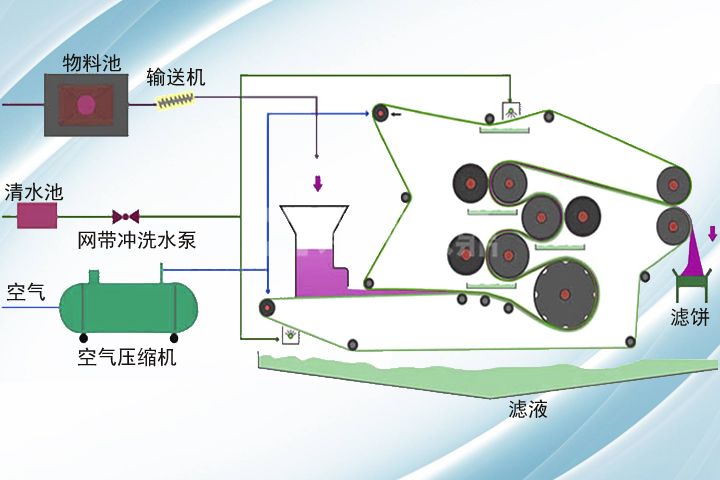 含水85%左右的濕物料經(jīng)過皮帶輸送機(jī)連續(xù)進(jìn)入料斗中(物料占帶寬可調(diào)節(jié)), 先通過一個(gè)獨(dú)立的濃縮段將大部分的自由水濾除減小物料的流動(dòng)性再經(jīng)過內(nèi)外兩條環(huán)狀濾帶在驅(qū)動(dòng)輥帶動(dòng)下,由螺旋壓料輥分布均勻,開始進(jìn)入下彎的弧形楔形區(qū)內(nèi),進(jìn)行初壓脫水,緊接著進(jìn)入低壓區(qū)內(nèi),一個(gè)帶“L”型壓條的壓輥將水份大量壓出,并保證水份從兩邊排出,隨后進(jìn)入對(duì)夾擠壓高壓區(qū),內(nèi)外濾帶繞過幾組直徑遞減的對(duì)夾擠壓輥,大量水分被緩緩地強(qiáng)力壓出,形成可壓榨的濾餅,另一方面,濾帶呈“S”型纏繞產(chǎn)生剃增的表面壓力的剪切力,在濾帶張力作用下外層濾帶對(duì)物料產(chǎn)生壓力將物料中的少量水份榨出,由于榨輥直徑逐漸減小,濾帶間物料所受壓力逐漸增加,少量水份不斷排出。物料中大量水份經(jīng)強(qiáng)力對(duì)夾輥擠榨排出,并通過接水槽收集排放,在內(nèi)外濾帶分開后,有耐磨型刮料裝置將內(nèi)外濾帶工作表面上脫水后的濾餅刮下。 后由高壓實(shí)心錐形凸型清洗噴嘴,形成扇形交叉水帶不斷沖洗網(wǎng)帶,以保持持續(xù)的脫水效果。