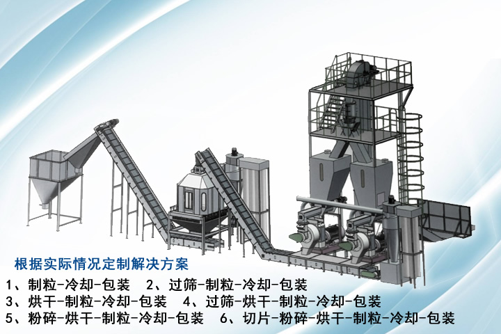 1、制粒-冷卻-包裝 2、過篩-制粒-冷卻-包裝 3、烘干-制粒-冷卻-包裝 4、過篩-烘干-制粒-冷卻-包裝