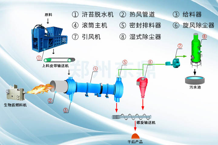滸苔烘干機(jī)生產(chǎn)線主要由壓榨脫水設(shè)備、熱源、上料機(jī)、進(jìn)料機(jī)、干燥主機(jī) 、出料機(jī)、引風(fēng)機(jī)、卸料器和配電柜、粉碎系統(tǒng)、打包系統(tǒng)等部件構(gòu)成;具體工藝如下水分含量高達(dá)80%以上的濕滸苔經(jīng)壓榨脫水系統(tǒng)擠壓脫水后水分降到65%左右,然后經(jīng)螺旋上料機(jī)進(jìn)入干燥系統(tǒng),在干燥滾筒內(nèi)均布的抄板翻動(dòng)下,進(jìn)行均勻分散與熱空氣充分接觸,加快了烘干傳熱、傳質(zhì)。在烘干過(guò)程中,物料在帶有傾斜度的抄板和熱介質(zhì)的作用下,至烘干機(jī)星形卸料閥排出烘干成品。