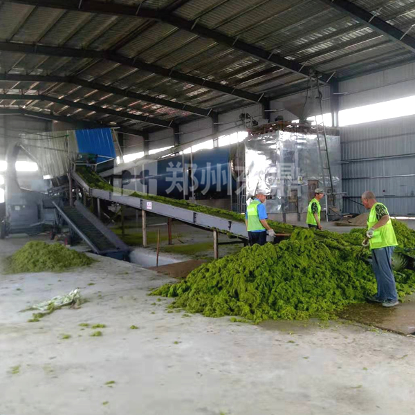 3、滸苔烘干工序:由于滸苔的變質(zhì)速度非??欤x開(kāi)海水的滸苔半天就會(huì)發(fā)臭,所以被運(yùn)到車(chē)間的滸苔必須快速烘干處理,烘干系統(tǒng)采用東鼎大型三環(huán)烘干機(jī)系統(tǒng),可以快速將滸苔水分降至臨界水分,便于儲(chǔ)存
